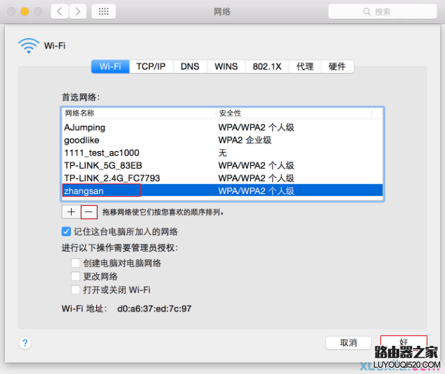 在彈出的對話框中,點擊 Wi-Fi,選擇需要刪除的無線信號,點擊”—“,再點擊 好,如下圖。