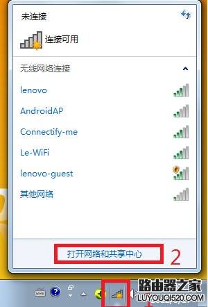 1. 左鍵點(diǎn)擊右下角上網(wǎng)圖標(biāo),出現(xiàn)連接信息后點(diǎn)擊“打開(kāi)網(wǎng)絡(luò)和共享中心”;