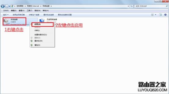 3. 若本地連接或無(wú)線網(wǎng)絡(luò)連接提示被禁用要將其開(kāi)機(jī),可以使用鼠標(biāo)右鍵點(diǎn)擊本地連接圖標(biāo),左鍵點(diǎn)擊啟用即可。