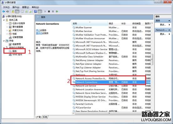 2. 點(diǎn)擊管理后會(huì)出現(xiàn)如下圖所示,點(diǎn)擊服務(wù)和應(yīng)用程序,在下方會(huì)出現(xiàn)“服務(wù)”選項(xiàng),雙擊“服務(wù)”,右側(cè)會(huì)出現(xiàn)服務(wù)列表,找到Network Store Interface Service、Network Connections兩項(xiàng)服務(wù);