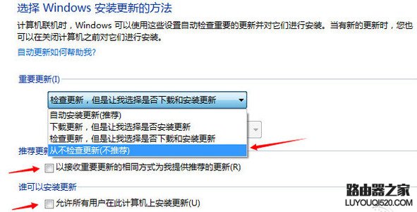 2、需要注意的是,如果你開啟了Windows自動更新,那么很可能會再次被安裝KB3035583補(bǔ)丁,因?yàn)槲④泴⒃撗a(bǔ)丁的等級設(shè)定為了“重要”。所以還需要到控制面板 -- Windows Update -- 更改設(shè)置,修改一下Windows 安裝更新的方式(如圖所示)。