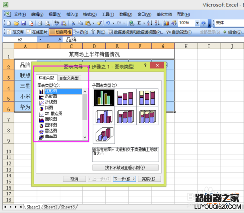 2、接下來,選擇插入——圖表。這里面有非常多的圖表樣式,我們先選擇一個最簡單的柱形圖表,然后下一步。