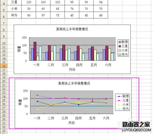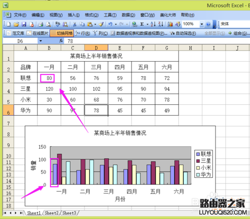 5、表格中數(shù)據(jù)的更改,圖表也隨之更改。我們可以試一下,把聯(lián)想一月份的銷量改為80,來看一下,圖表也隨之改成了80。這說明,圖表和表格之間是完全對應的。