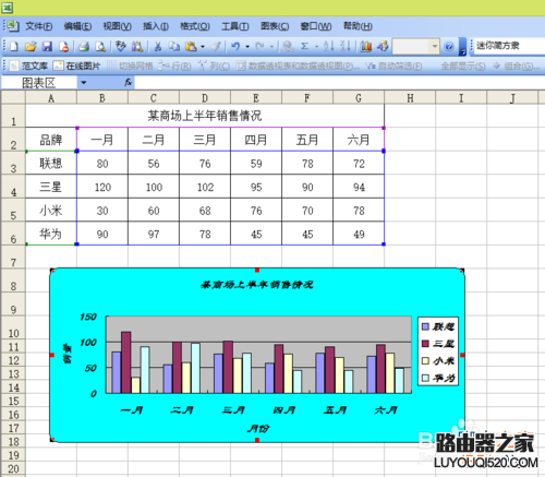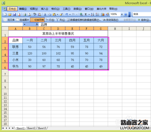 1、首先在我們制作出我們需要的表格,第一步選中數(shù)據(jù),不要選擇“某商場上半年銷售情況“這一單元格,因為它是已經(jīng)合并了的。