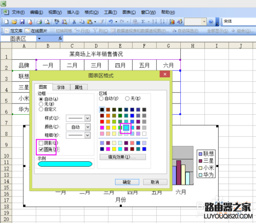 7、現(xiàn)在教大家修改圖表的樣式,雙擊圖表的空白區(qū)域,就會彈出一個對話框,可以設置圖表的背景色,改變圖表邊框等。如圖:所設置的圖表背景為藍色,圓角。