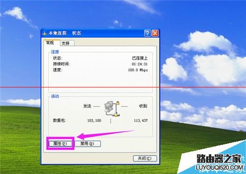 1、按方法一的步驟,打開本地連接,在“本地連接 狀態(tài)”窗口中,點(diǎn)擊“屬性”按鈕。如圖