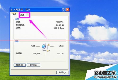 4、在“本地連接 狀態(tài)”窗口中,點(diǎn)擊“支持”。如圖