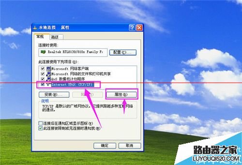 2、然后,在屬性窗口下,選擇Internet 協(xié)議(TCP/IP)。然后點(diǎn)擊“屬性”按鈕,如圖