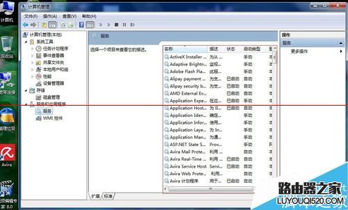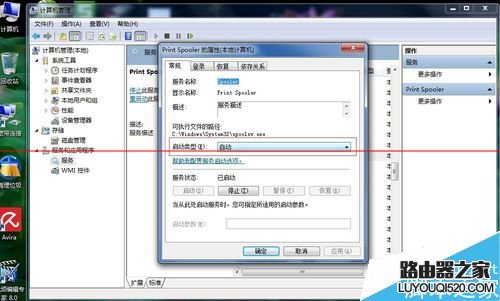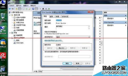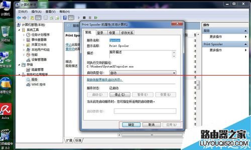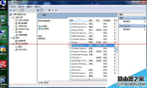 3、點擊選擇“服務”項,關注右邊紅色線框內參數,找到“Print Spooler”服務項,并雙擊進入;