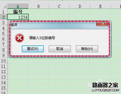 確定后試試在A列輸入“123456”不會成功并彈出錯誤警告。