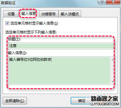 還有呢,在輸入信息前當點擊單元格時可以讓其顯示輸入提醒。這個操作還是在“數據驗證”下,在“輸入信息”選項卡。小編的提醒設置為“標題:注意 內容:請輸入編號為5為阿拉伯數字”。