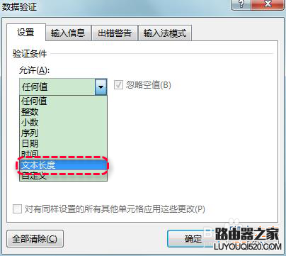 目的是要限定A列輸入的文本個數,所以在“設置”選項卡的驗證條件“允許”里面選擇“文本長度”。