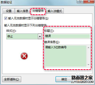 其實,錯誤警告的內容是可以自行設置的,如圖,還是在“數據驗證”,切到“出錯警告”選項卡,然后自行填寫警告標題與內容就可以了。比如小編填寫“標題:錯誤 內容:請輸入5位數編號”。