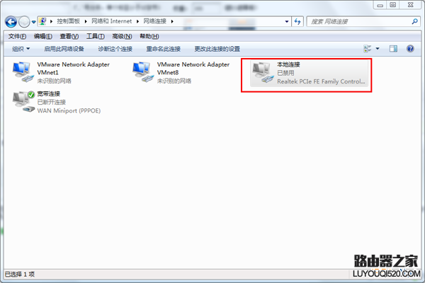 5.此時(shí)會(huì)打開(kāi)如下界面,可以找到“本地連接”的圖標(biāo),此時(shí)我們可以看到本地連接顯示為“已禁用”的狀態(tài),所以會(huì)出現(xiàn)網(wǎng)絡(luò)連不上等一系列網(wǎng)絡(luò)問(wèn)題,選擇本地連接使用鼠標(biāo)右鍵后選擇“啟用”即可讓網(wǎng)絡(luò)恢復(fù)啟用