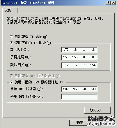 6.4 在彈出的屬性窗口,勾選“使用下面的 IP 地址(S)”,然后根據實際的網絡情況輸入 IP地址、子網掩碼、網關和 DNS 地址。如果不清楚需要設置什么值,可以聯系網絡管理員或者網絡服務提供商。確認無誤后,點擊“確定”按鈕。如下圖所示: