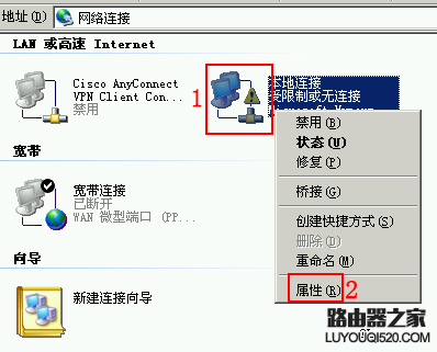 6.2 在彈出的窗口中,選擇對應的網卡名稱如本地連接(注:如果是無線網絡請選擇無線網卡,其他操作可以繼續參考),然后點擊鼠標右鍵并選擇菜單中的“屬性(R)”。如下圖所示: