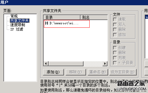 點擊FileZilla 上面的一個小人,然后在常規中添加一個用戶并為他設置密碼,然后點擊共享文件夾來設置需要共享的文件,目錄選擇網站下的uploads目錄,因為圖片和附件都存放在這里,當然需要注意文件的權限。