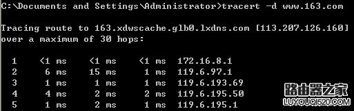 2、如果手頭一下沒(méi)這個(gè)軟件怎么辦呢?這時(shí)也可在客戶機(jī)運(yùn)行路由跟蹤命令如:tracert -d www.163.com,馬上就發(fā)現(xiàn)第一條不是網(wǎng)關(guān)機(jī)的內(nèi)網(wǎng)ip,而是本網(wǎng)段內(nèi)的另外一臺(tái)機(jī)器的IP,再下一跳才是網(wǎng)關(guān)的內(nèi)網(wǎng)IP;正常情況是路由跟蹤執(zhí)行后的輸出第一條應(yīng)該是默認(rèn)網(wǎng)關(guān)地址,由此判定第一跳的那個(gè)非網(wǎng)關(guān)IP地址的主機(jī)就是罪魁禍?zhǔn)住?/p>