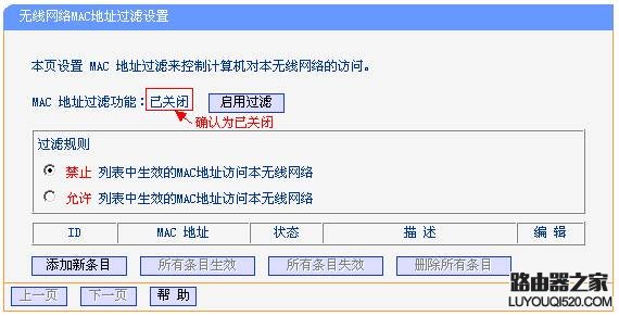 路由器上開啟了無線MAC地址過濾,規則設置不當也會引起無線連接不成功,建議暫不啟用該功能。