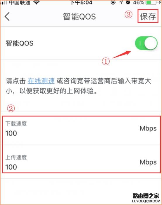 2、打開智能QOS開關(guān)后,在“下載速度和上傳速度”里正確輸入您寬帶的下行速度和上行速度,點(diǎn)擊“保存”。如下圖所示: