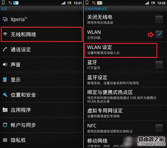 1、進(jìn)入安卓手機(jī)設(shè)置,然后再進(jìn)入【無線和網(wǎng)絡(luò)】設(shè)置,然后先開啟無線網(wǎng)絡(luò),也就是選勾選打開【W(wǎng)LAN】,然后再點(diǎn)擊進(jìn)入【W(wǎng)LAN設(shè)置】,如下示意圖所示。