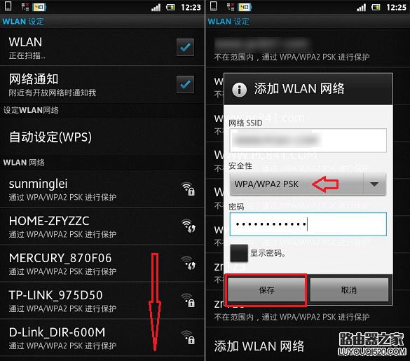 2、進(jìn)入安卓手機(jī)無線網(wǎng)絡(luò)設(shè)置后,會(huì)看到可以搜索到很多無線網(wǎng)絡(luò)信號(hào),由于自家的無線網(wǎng)絡(luò)SSID名稱隱藏,因此我們無法直接看到需要連接的無線網(wǎng)絡(luò)名稱,而是需要點(diǎn)擊最底部的【添加WLAN網(wǎng)絡(luò)】,接下來需要輸入隱藏的SSID名稱、安全性里面選擇【W(wǎng)PA/WPA2 PSK】,最后在下方的密碼處填寫上無線網(wǎng)絡(luò)密碼即可,完成后,點(diǎn)擊“保存”即可,如下示意圖所示。