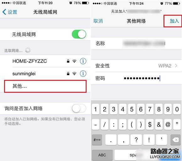 2、進(jìn)入無線網(wǎng)絡(luò)設(shè)置后,首先開啟“無線局域網(wǎng)”然后在搜索網(wǎng)絡(luò)列表底部點(diǎn)擊進(jìn)入【其它】,在之后彈出的其他網(wǎng)絡(luò)設(shè)置中,名稱里填寫上路由器隱藏SSID名稱,安全性選擇WPA2,在底部的密碼中,同樣是輸入無線網(wǎng)絡(luò)密碼,完成后,點(diǎn)擊右上角的【加入】即可,如下圖所示。