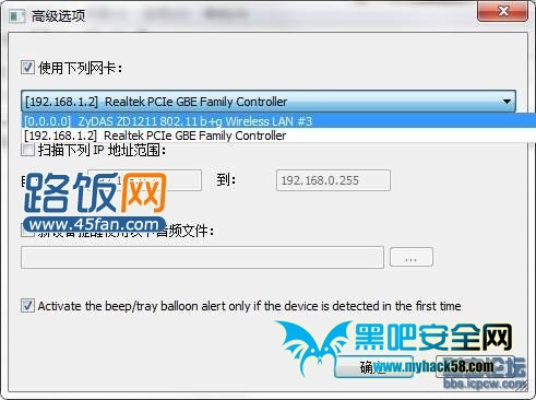 3、該軟件還有一個監視報警功能,點擊菜單欄“選項”勾選“連接新設備時聲音提示”選項(如圖3),這樣一旦有其他電腦或設備闖入你的網絡中,軟件就會發出報警的聲音,當然在“高級選項”中還可以設置報警的聲音文件。如下圖所示: