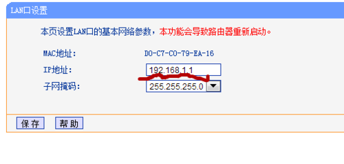 1、首先檢查主、副路由器IP地址是否沖突(這里以192.168.1.1為例)會造成無法正常上網。這時根據我們橋接路由器時在DHCP服務器里設置的IP地址區間改寫LAN設置里的IP地址。