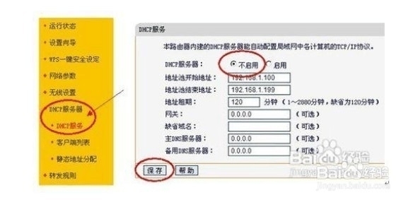 5.副路由器要設置為“不啟用”DHCP功能,如下圖,選好后點“保存”。