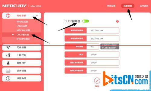 4、進入路由器后找到“高級設置”——“網絡設置”——“DHCP服務器”;