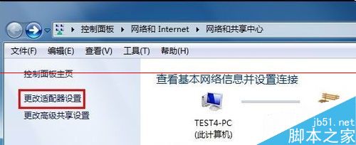 第二步:彈出 網絡和共享中心 的界面,點擊 更改適配器設置。如下圖所示: