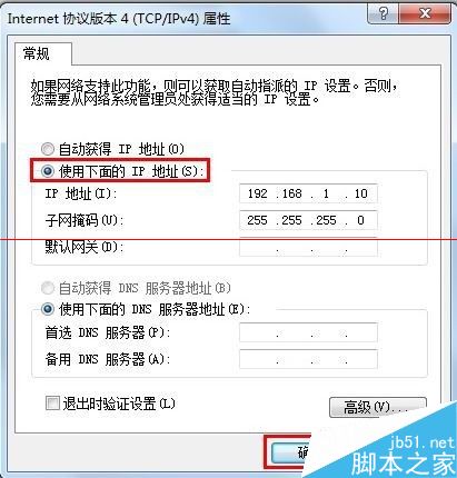 第五步:選擇 使用下面的IP地址(S);設置IP地址為 192.168.1.10,子網掩碼為 255.255.255.0,網關為192.168.1.1,點擊 確定。如下圖所示: