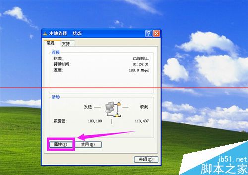 1、按方法一的步驟,打開本地連接,在“本地連接 狀態”窗口中,點擊“屬性”按鈕。如圖