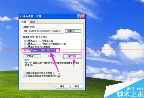 2、然后,在屬性窗口下,選擇Internet 協議(TCP/IP)。然后點擊“屬性”按鈕,如圖