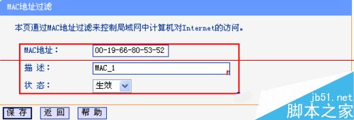 4、然后在地址欄里面輸入設備的MAC地址,步驟為添加,然后再點擊最下面的保存項,這樣操作就完成了。