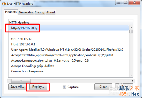 待安裝并重啟瀏覽器后,運行組件“Live HTTP”工具,并在瀏覽器地址欄輸入路由器地址并訪問,此時將在LIVE HTTP界面顯示如圖所示的信息,選中其中的某一條信息,點擊“Replay”按鈕。