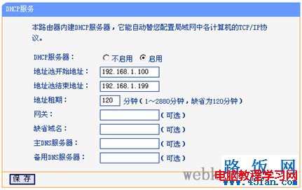 首先選擇啟用DHCP服務器(如上圖),這樣就可以利用自動分配地址功能。地址池開始地址:DHCP服務器所自動分配的IP的起始地址。地址池結束地 址:DHCP服務器所自動分配的IP的結束地址。網關:可選項,建議填入路由器LAN口的IP地址,缺省是192.168.1.1,缺省域名可不填,DNS可詢問當地ISP運營商或查詢DNS地址