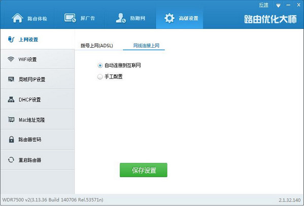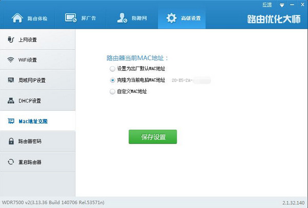 一般的網(wǎng)絡(luò)只需要設(shè)置正確的上網(wǎng)帳號(hào)和密碼即可正常撥號(hào)上網(wǎng),但也有部分地區(qū)網(wǎng)絡(luò)運(yùn)營商會(huì)對(duì)用戶做單一限制,只允許同時(shí)段一個(gè)用戶上線。可以在能正常寬帶撥號(hào)上網(wǎng)的電腦上使用路由優(yōu)化大師,進(jìn)入高級(jí)設(shè)置頁面,Mac地址克隆中選中克隆為當(dāng)前電腦MAC地址后保存設(shè)置,重啟路由器生效。