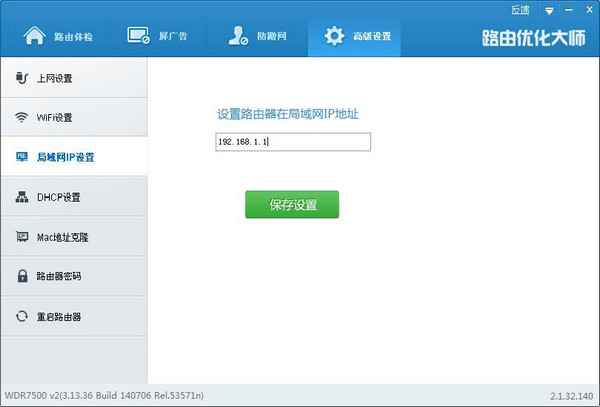 這時(shí)可以進(jìn)入高級(jí)設(shè)置頁面,局域網(wǎng)IP設(shè)置中將默認(rèn)網(wǎng)關(guān)IP改為其他網(wǎng)段,例:192.168.2.1。
