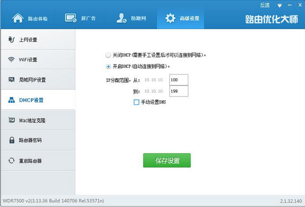 如果是需要將二級(jí)路由器當(dāng)網(wǎng)橋使用,可以設(shè)置上一步之后,到高級(jí)設(shè)置頁面,DHCP設(shè)置中選中關(guān)閉DHCP,保存設(shè)置后,再將主路由器的lan口網(wǎng)線連接到二級(jí)路由器的任意一個(gè)lan口,重啟路由器。