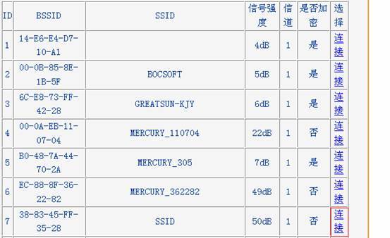 在掃描到的信號列表中選擇B路由器SSID號,如下圖中SSID,點擊“連接”。