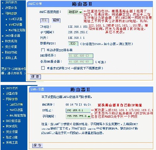 要點:路由器設置的WAN 口為動態IP 以便從第一個路由器那里獲得IP 地址,更改它自己的IP 地址和DHCP 到另一個網段去使之與第一個路由器不在同一個網段。
