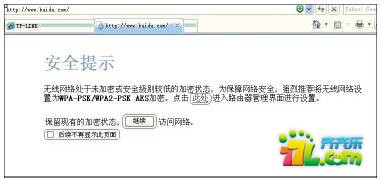 按照步驟二的方法將您的電腦通過無線的方式連接到路由器后,就可以上網(wǎng)了。如果電腦在打開網(wǎng)頁時有如下頁面的“安全提示”信息,表示您的無線沒有進行加密或者沒有選擇足夠安全的加密方式,請按該頁面的提示設(shè)置無線安全。