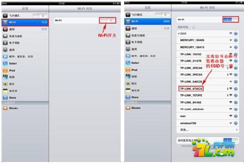 打開IPAD主界面,選擇“設(shè)置”菜單后點擊Wi-Fi進入Wi-Fi網(wǎng)絡(luò)界面。然后開啟Wi-Fi開關(guān)并在無線網(wǎng)絡(luò)列表中單擊您自己路由器的無線信號。