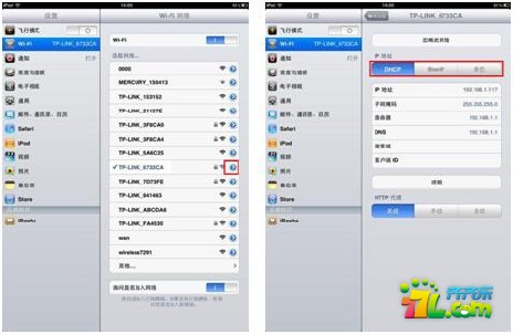 如果您需要手動指定IPAD的IP地址等網(wǎng)絡(luò)參數(shù)時,可在無線網(wǎng)絡(luò)列表的無線SSID號后點擊“>”按鈕,然后點擊“靜態(tài)”來手動設(shè)置IPAD的網(wǎng)絡(luò)參數(shù)。