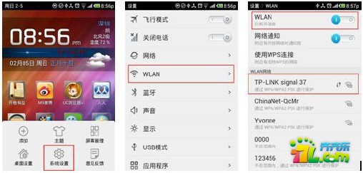 點擊手機的菜單按鈕,選擇系統(tǒng)設(shè)置。在設(shè)置菜單中選擇WLAN,打開WLAN的開關(guān),選擇您的無線路由器名稱: