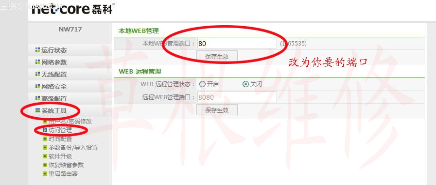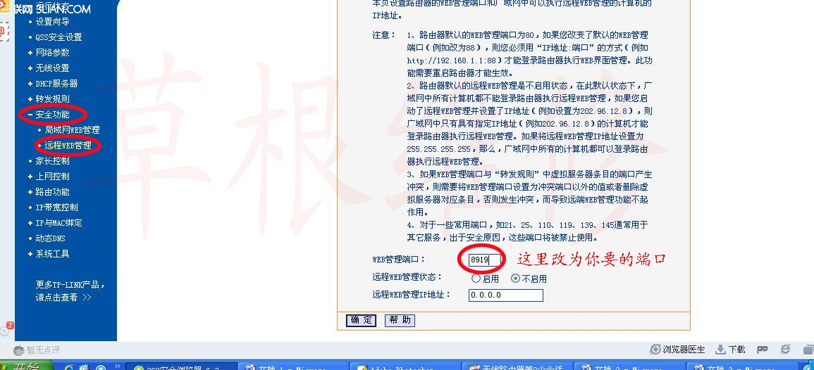 2、找到WEB管理,各種路由器顯示不同,我以TP-LINK路由器為圖。一般顯示為WEB管理端口:80 這時我們將數(shù)值改為8919 。點擊確定然后重啟或者拔掉路由器的電源。然后我們進入路由器的地址就是:http://192.168.1.1:8919或者是http: //192.168.1.1:8919 (這里改過路由器IP的前面是你改過的IP后面加你改的端口就行了)訪問地址前必須加http://+路由器IP+更改的端口。不是這種格式你訪問不了 的。