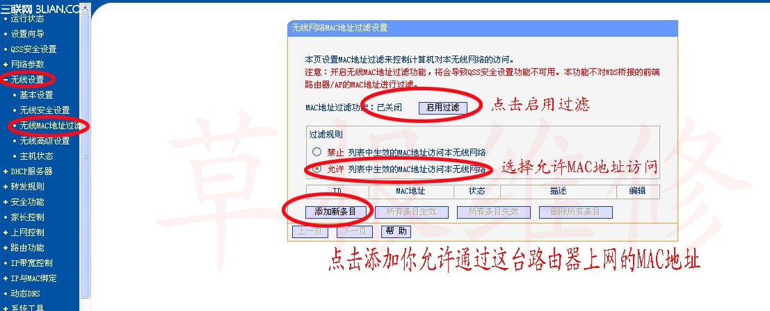 5、點擊添加新條目(也就你是允許連接的MAC地址)。