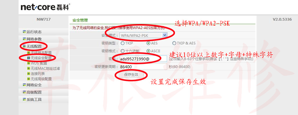 三、修改無線路由器密碼,選擇WPA2加密的形式,密碼長度也建議10位以上字母+數(shù)字組合還有特殊符號組合。增加密碼難度和破解難度。強烈推薦